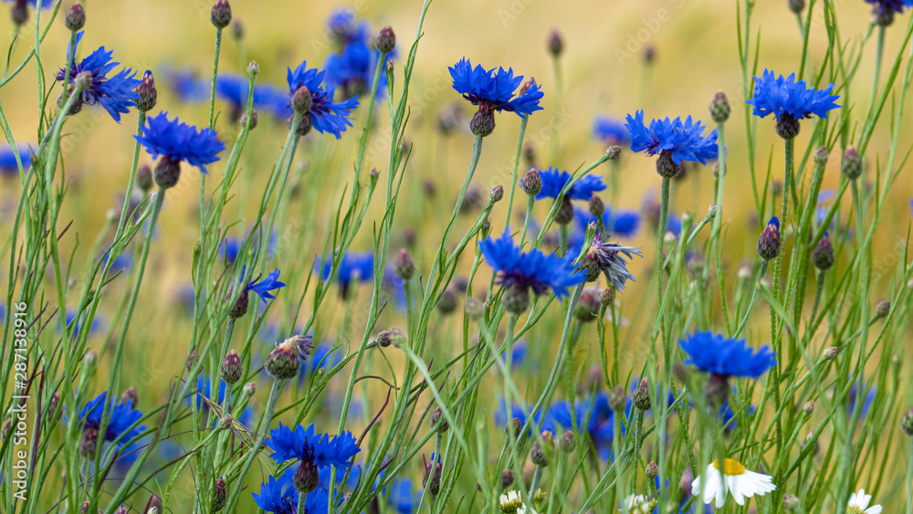 Foto Blue cornflowers (Centaurea cyanus) in a green meadow