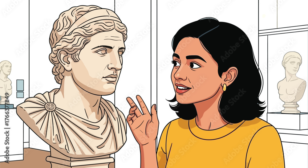 Foto Intrigued woman explores ancient history, admiring sculpture in modern museum, s