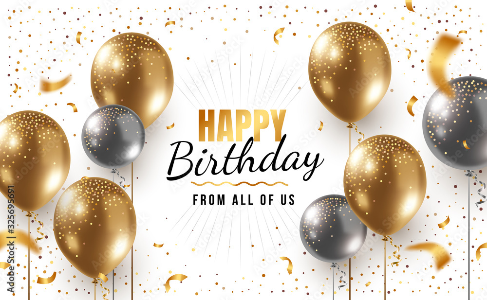 Foto Vector happy birthday horizontal illustration with 3d realistic golden and silver air balloon on white background with text and glitter confetti