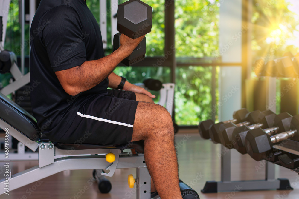 Foto Fitness men workout with dumbbell at the gym in sunrise