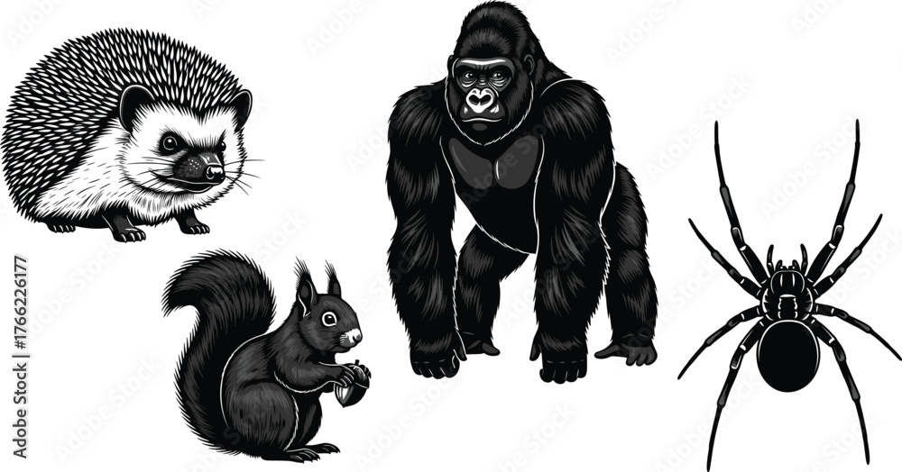 Fototapete Animal silhouette set, hedgehog, squirrel, gorilla, spider, wildlife diversity,