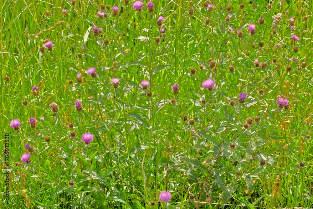 Fototapete purple flowers of brown knapweed in a green field- Centaurea jacea