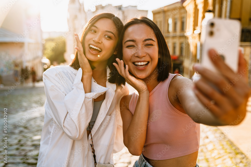 Fototapete Two young beautiful smiling happy asian girls taking selfie