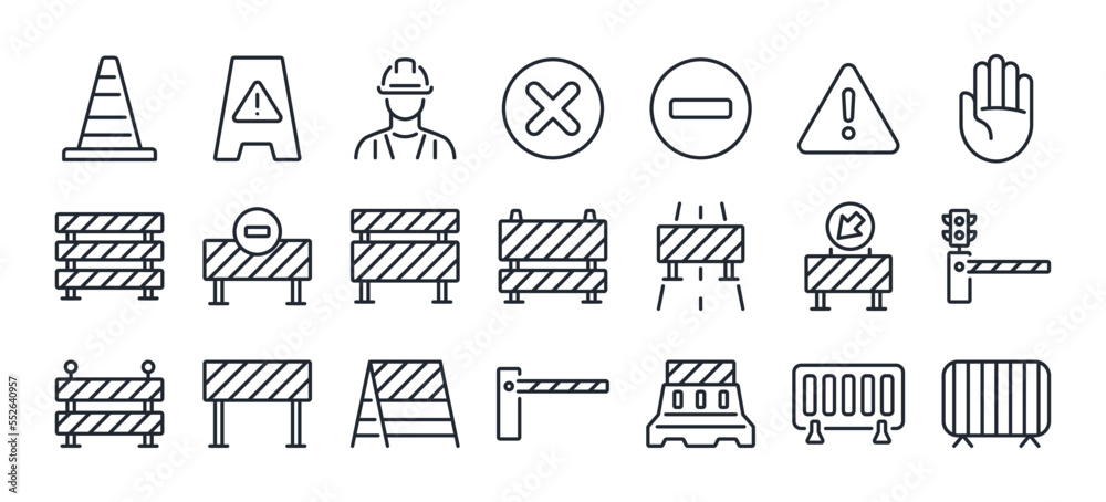 Bild auf Leinwand Road block and pedestrian barrier editable stroke thin linear outline icons set isolated on white background flat vector illustration