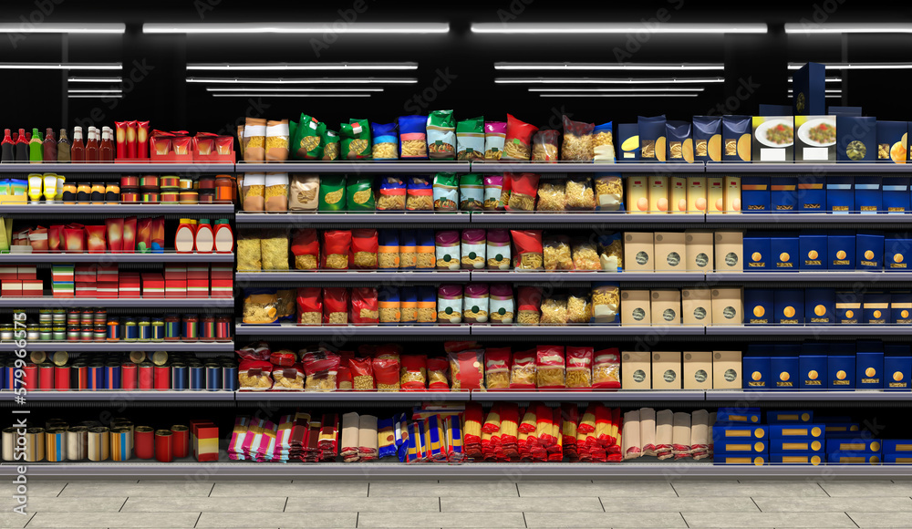 Bild auf Leinwand Pasta, spaghetti, Fusilli, Lasagna with Sauce packagings on shelf