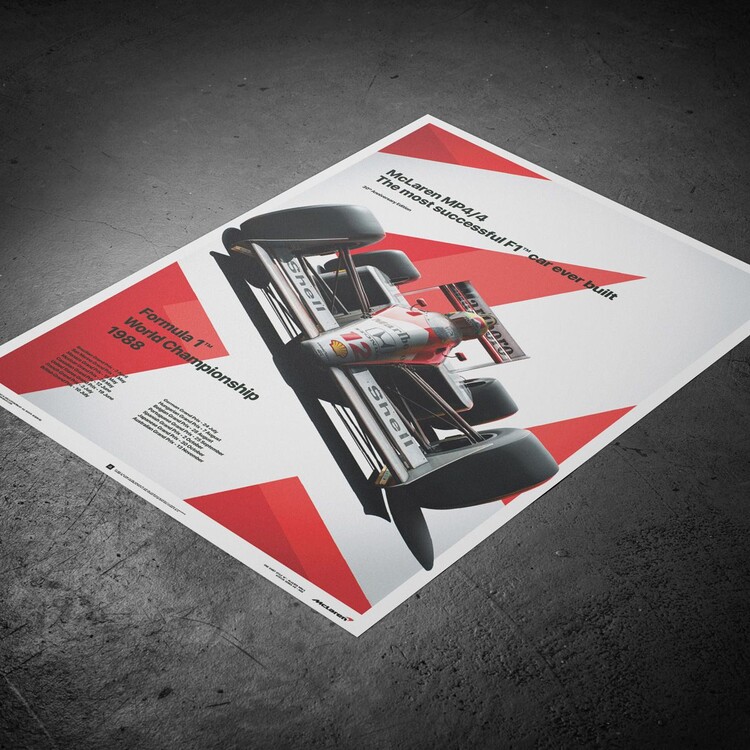 Um Sennas ersten Titelgewinn im Jahr 1988 zu feiern, wandte sich McLaren an Automobilist, um einen entscheidenden Moment der Saison wieder zum Leben zu erwecken. Gemeinsam entschieden wir uns für den Großen Preis von San Marino - das Rennen, bei dem die Welt zum ersten Mal erkannte, wie besonders die Paarung Senna/McLaren war und wie das Team im Begriff war, eine Saison wie nie zuvor zu dominieren. Unser Kunstwerk zeigt Sennas McLaren MP4/4 mit seiner unverwechselbaren rot-weißen Lackierung, im Rennen getragen, mit genau demselben Schmutz und denselben Details, die man am Renntag sehen konnte.