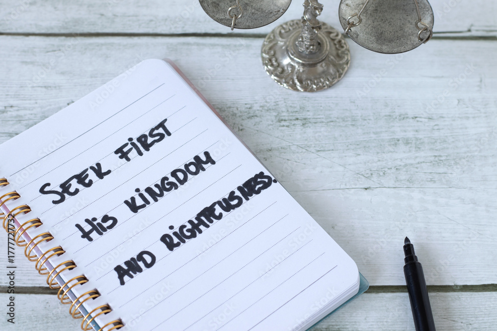Sticker Plakat Inspirational Christian text to seek God first and His righteousness with balance scales