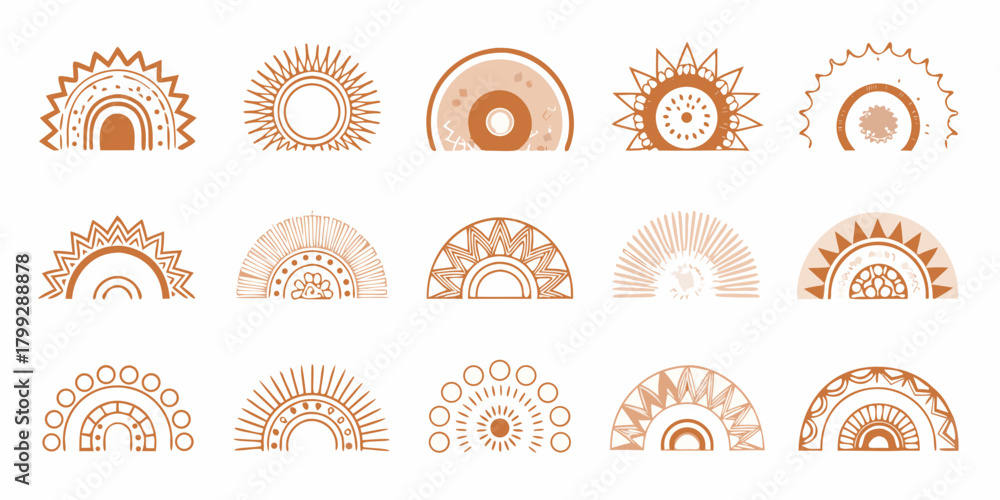 Sticker Plakat Collection of boho sun and rainbow elements in earthy tones on white background