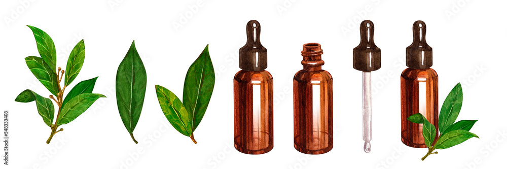 Sticker Plakat Bay set essential oil, bay leaves, amber glass bottle, dropper