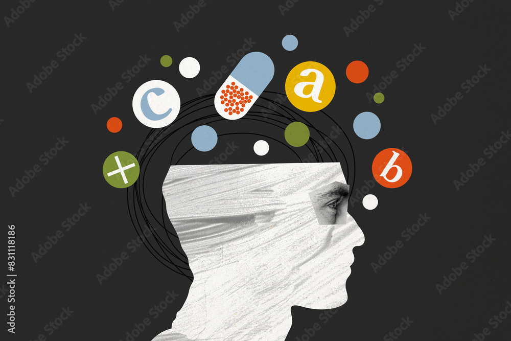 Sticker Plakat Composite photo collage of white shape man silhouette cut head pills schizophren